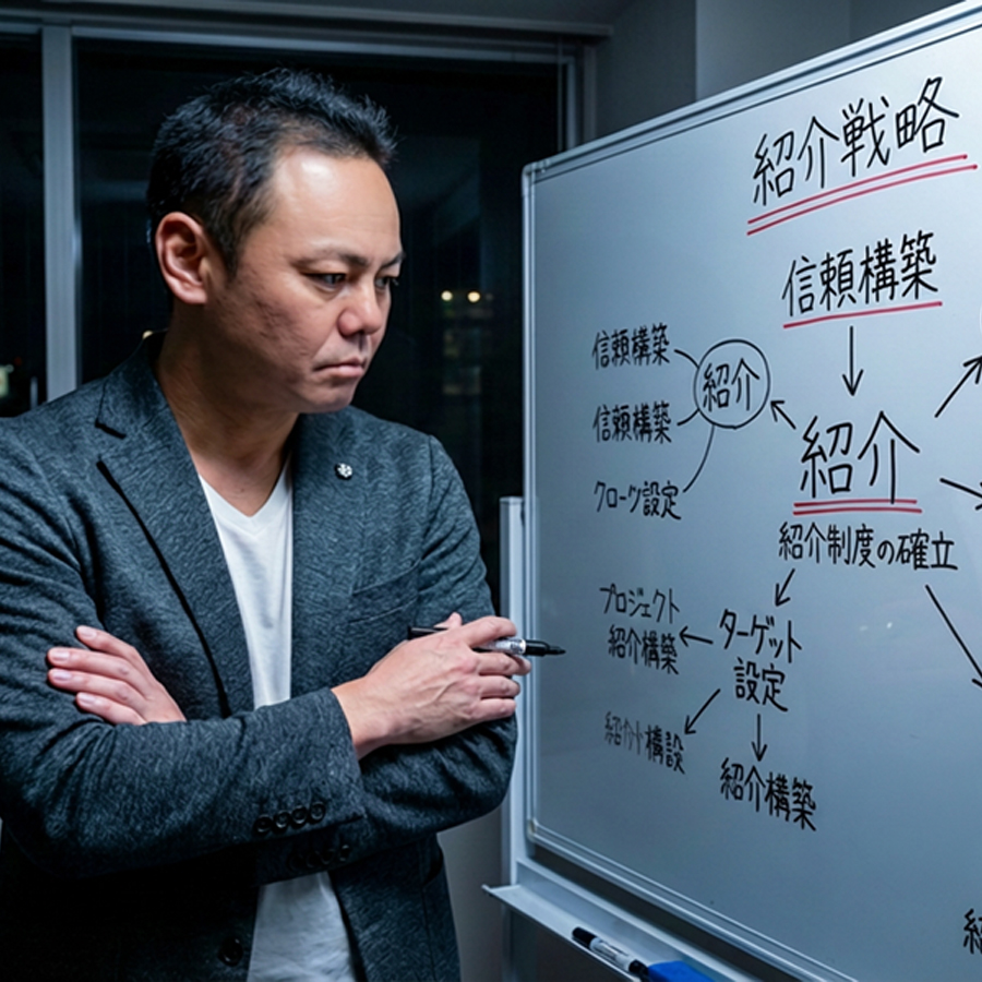「待つだけ」の紹介はもう終わりです。ターゲットに刺さる言葉で紹介依頼を言語化し、 意図的に紹介を発生させる。そして、紹介から成約に至るまでの勝ちパターンを確立することで、一過性のラッキーではなく、何度でも成果を再現できる盤石なビジネス基盤を構築します。